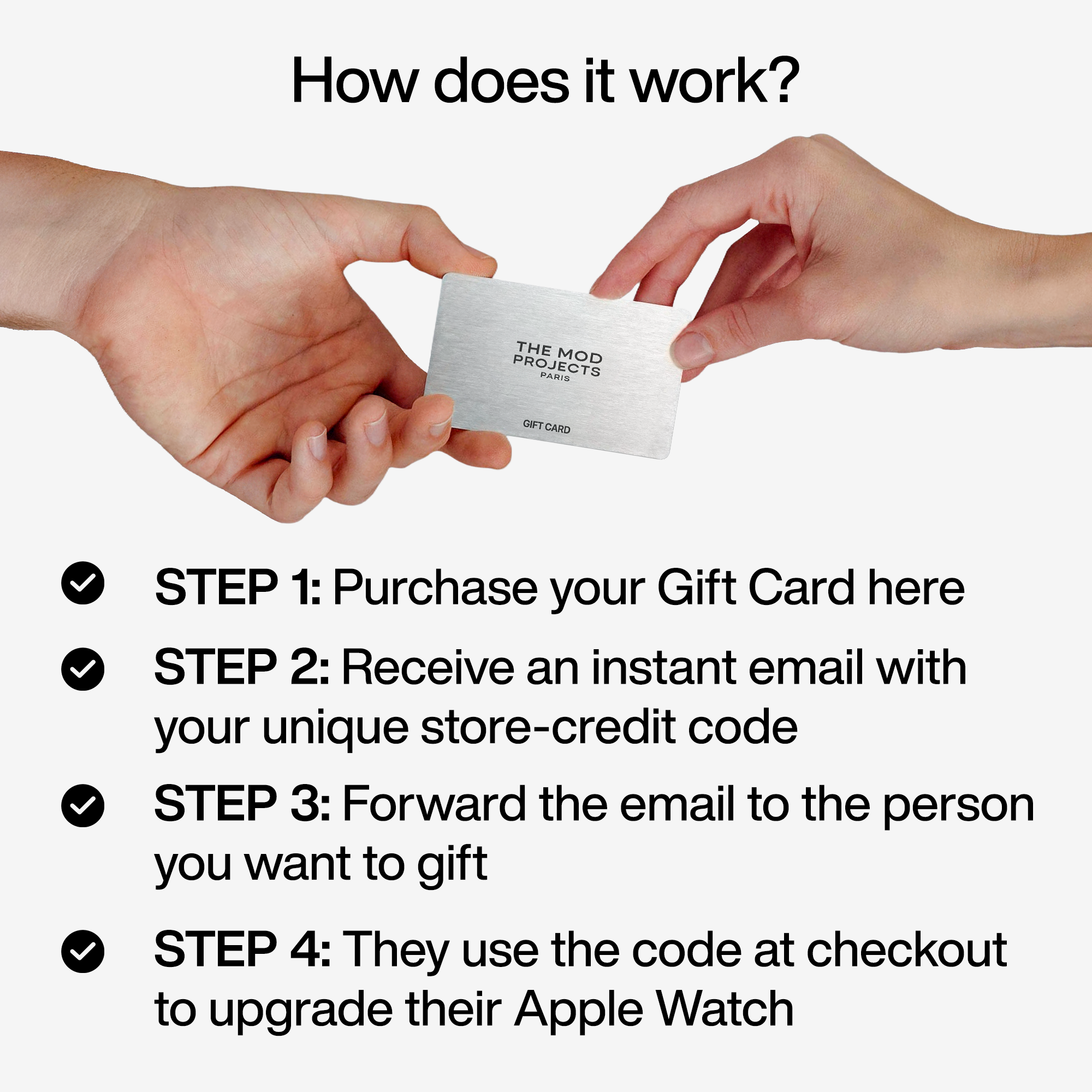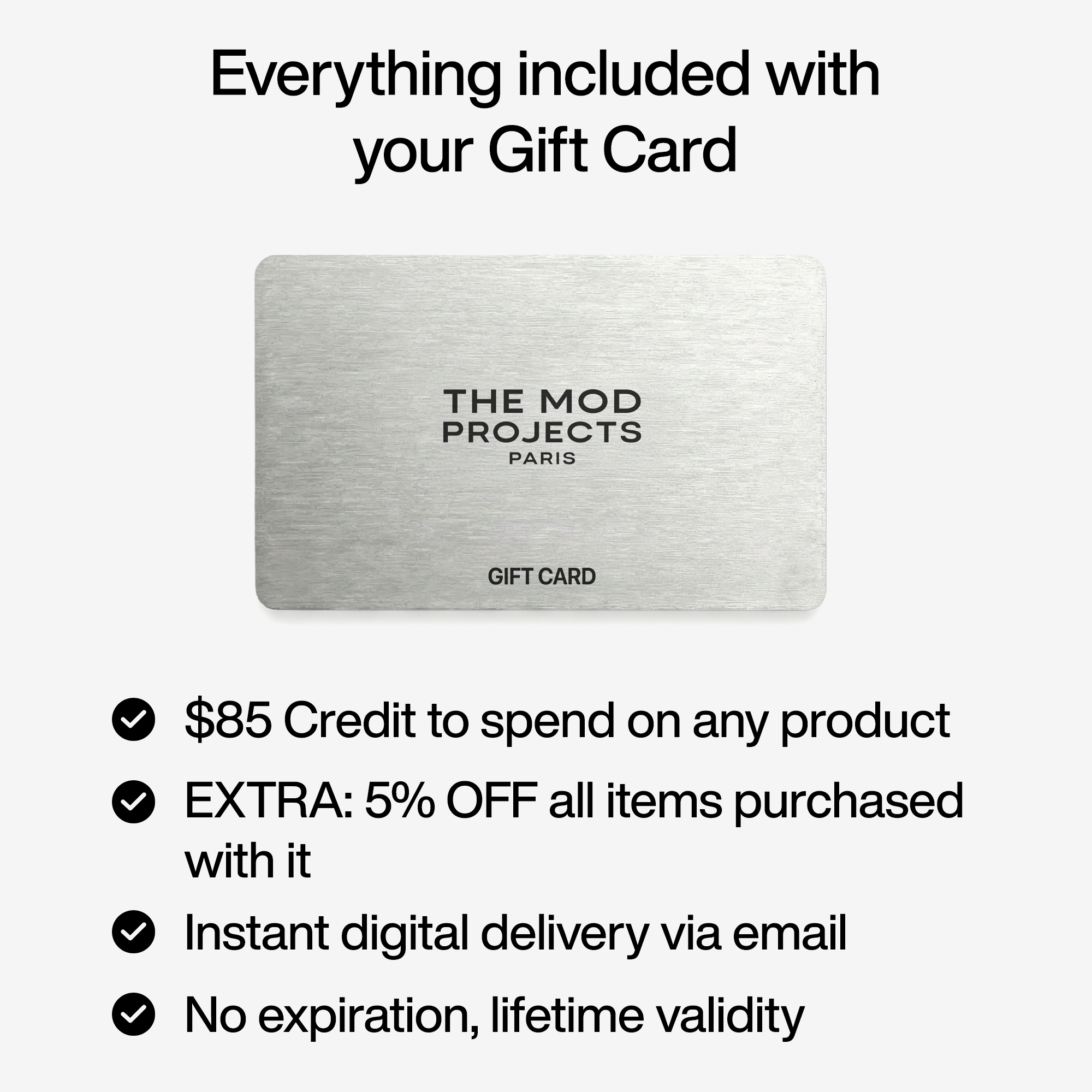 Our Gift Cards are delivered instantly via email and can be used on any product on the store. From Mod Cases to premium straps and bundles. Each card also includes an extra discount automatically applied at checkout, making it the smartest way to shop The Mod Projects.