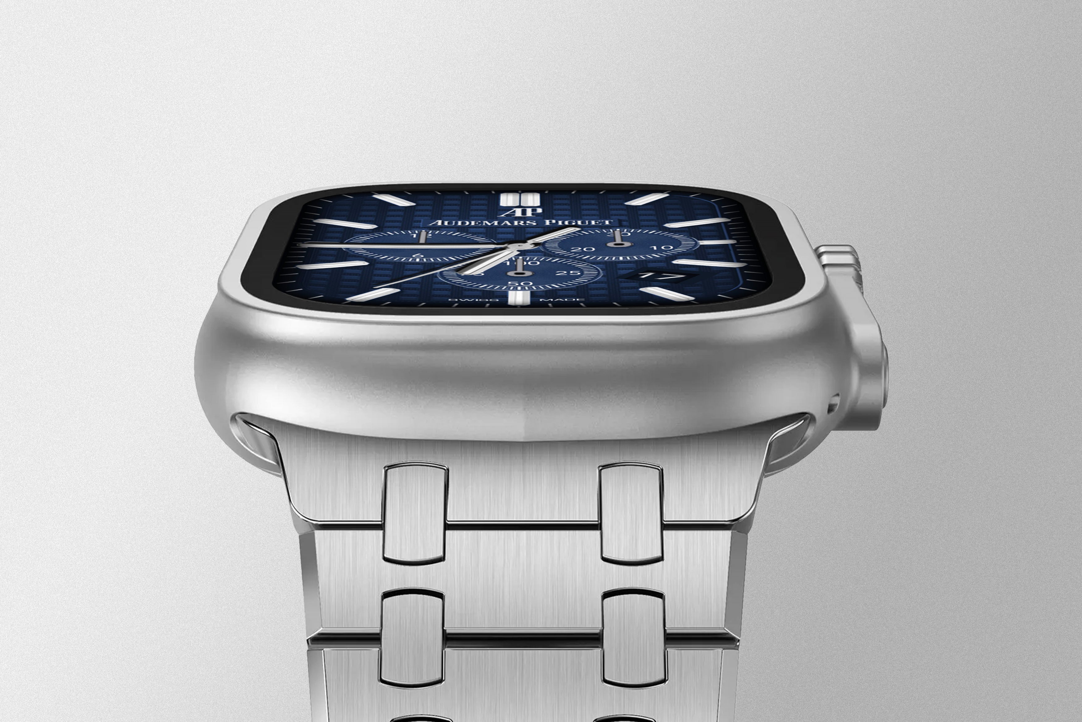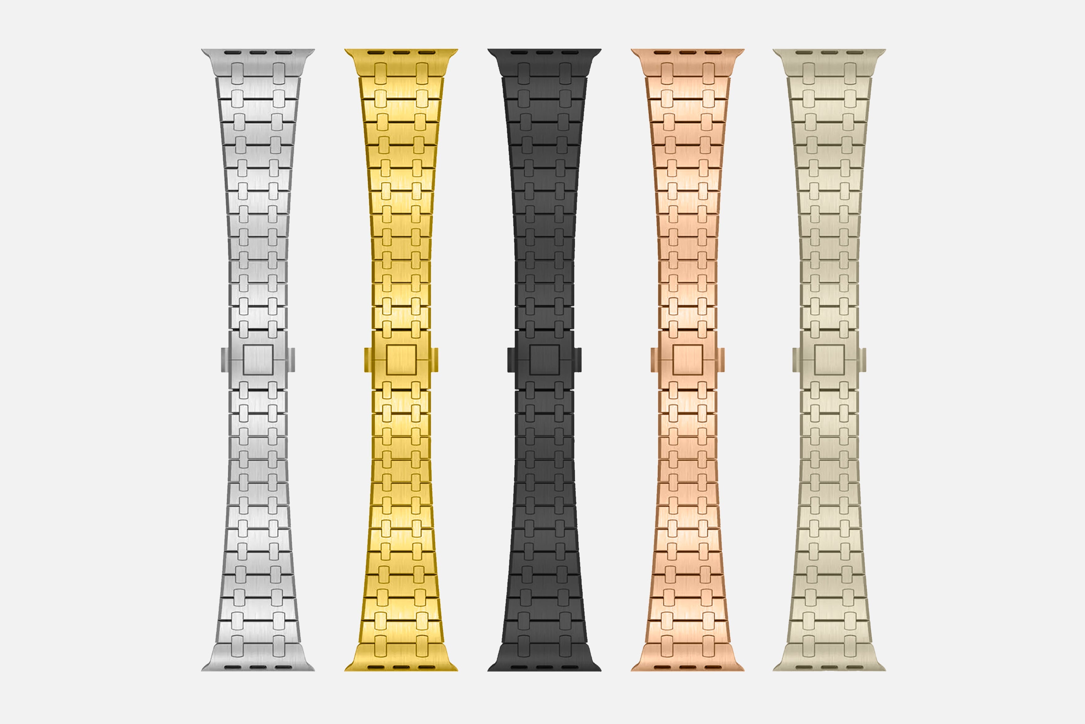 The iconic design cherished in the world of luxury is now accessible to all Apple Watch owners with the new Royal Strap. Crafted from durable stainless steel alloy, it features spring-loaded links for unmatched comfort and flexibility on your wrist.